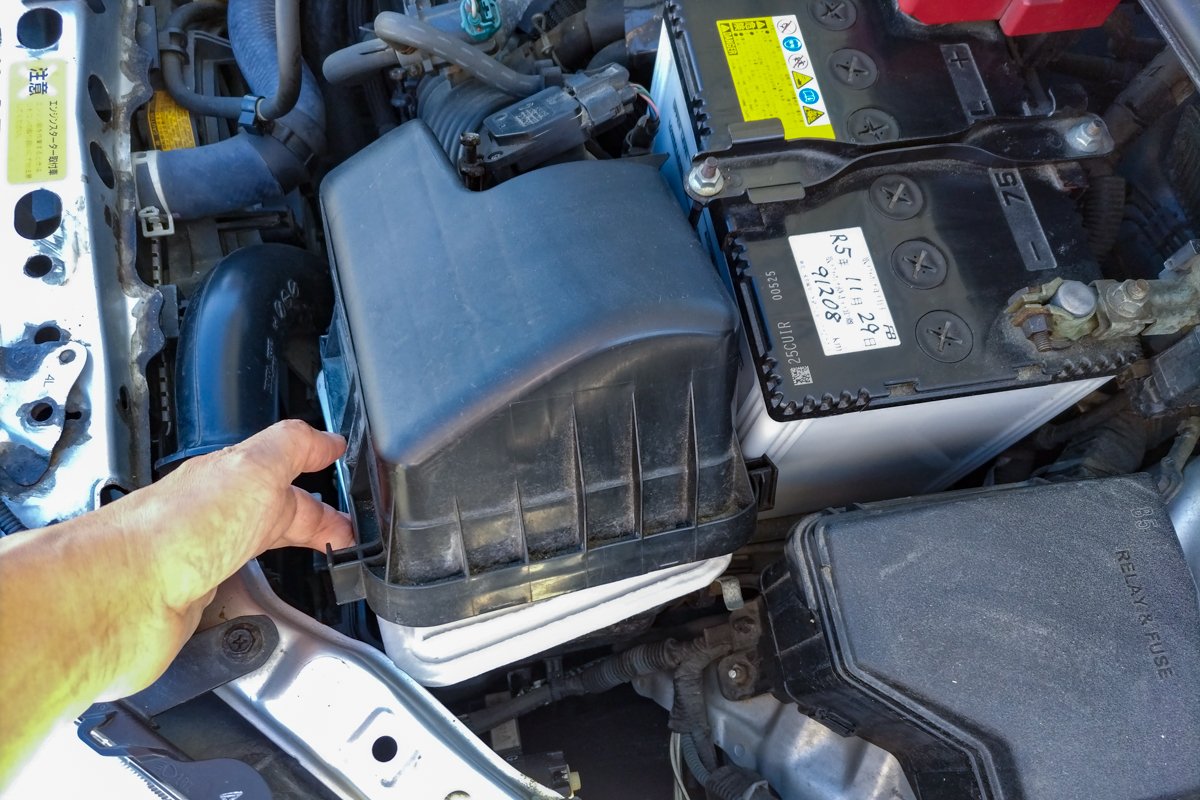 これはエンジンルーム内の吸気用エレメント。プラスチックの箱に収納されているので、開けて交換します。