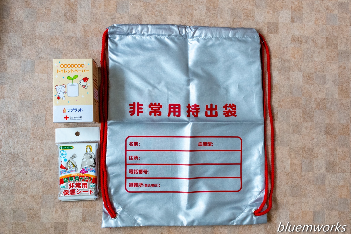 保険会社のポイント交換や献血で、非常用持出袋や非常用保温シート、被災時用トイレットペーパーを持っていました。