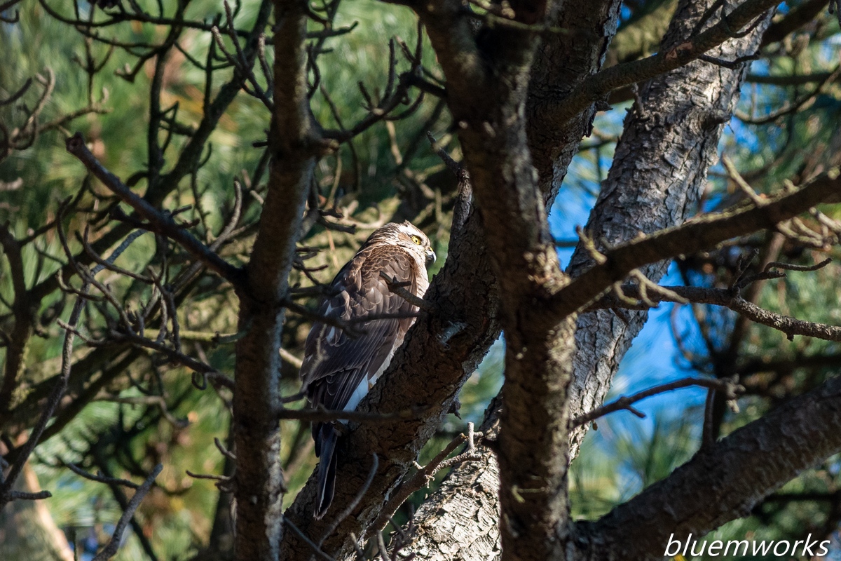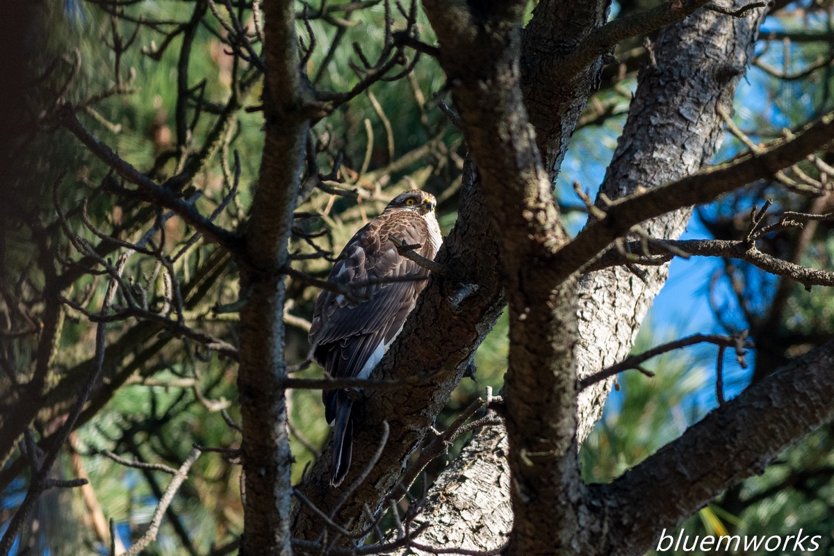 撮影している時はオオタカ幼鳥かなと思っていたのですが、少し見える胸の斑模様と顔の模様でハイタカ幼鳥であると思います。