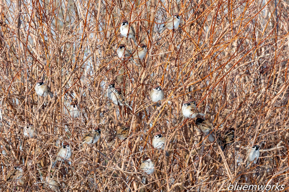 K-5Ⅱs/ DA★300㎜f4ED [F8 1/750 ISO280 ±0EV] このスズメファミリーは40~50羽の集団でこの界隈に住んでいまして、通るたびに賑やかでほっこりするんです。 ちなみに我が家周辺では、隣家の一人住まいのお爺さんが亡くなってから、そこの物置や軒裏で営巣していた集団が居なくなりスズメの姿をほとんど見なくなりました。 私も水浴びと砂浴びが出来るようにと、大きめの植木鉢を置いてその様子を眺めていたのですが、人が居なくなるとスズメも居なくなるというのは本当だなと、実感していました。 ちなみに自宅周辺は、スズメよりもカワラヒワが多いです。スズメの木 bluem 2026/02/02 野鳥 No Comments