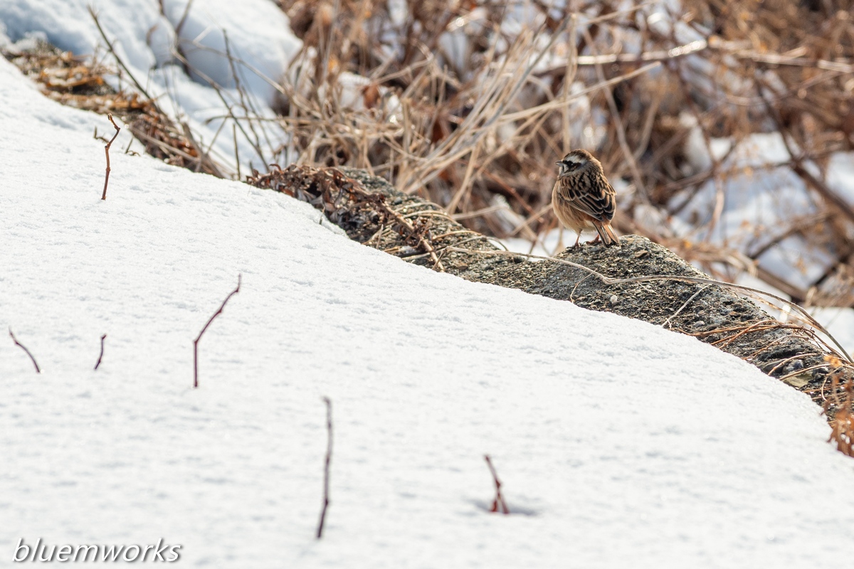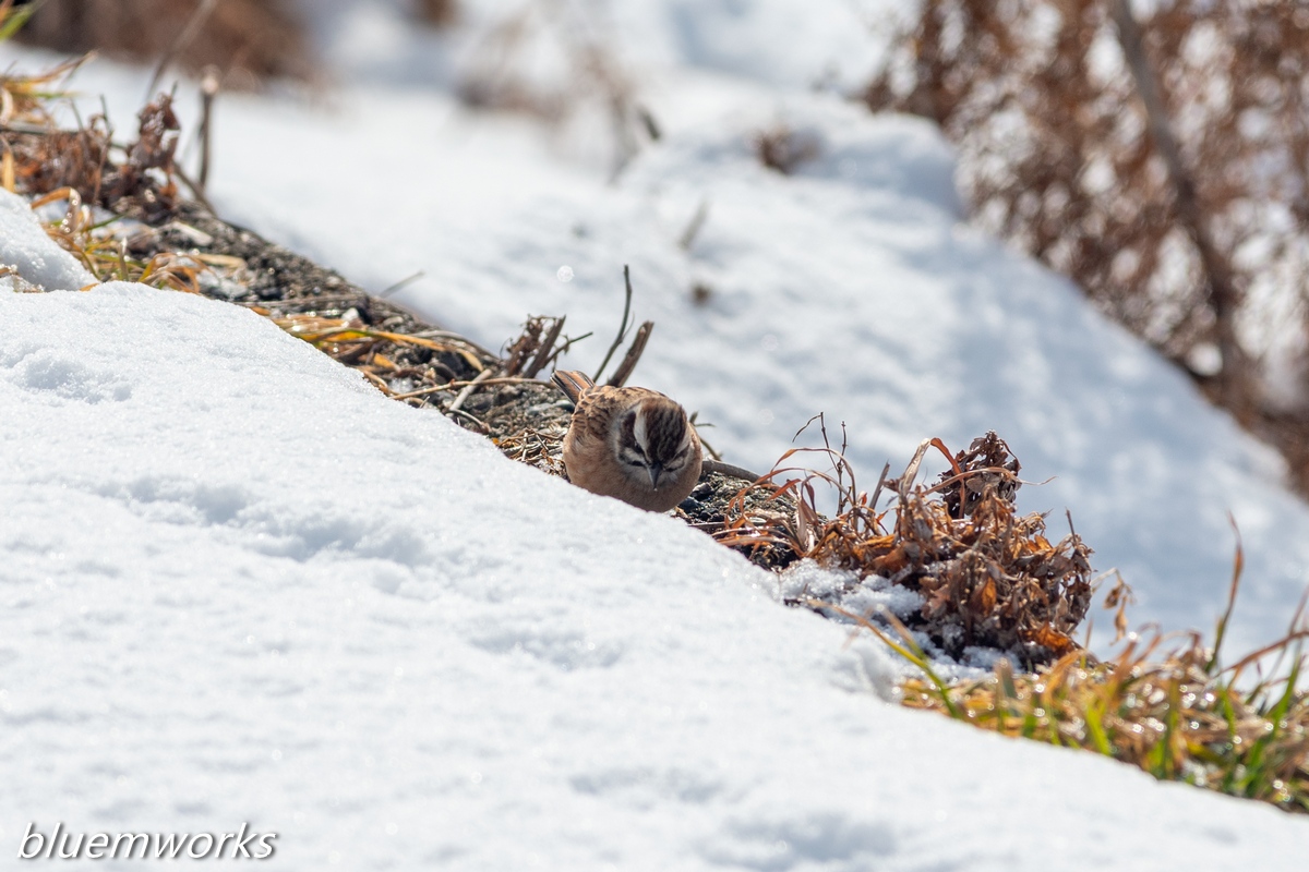 餌である草の種子が雪に覆われているので、こうして雪が解けたところに野鳥が集まってきます。