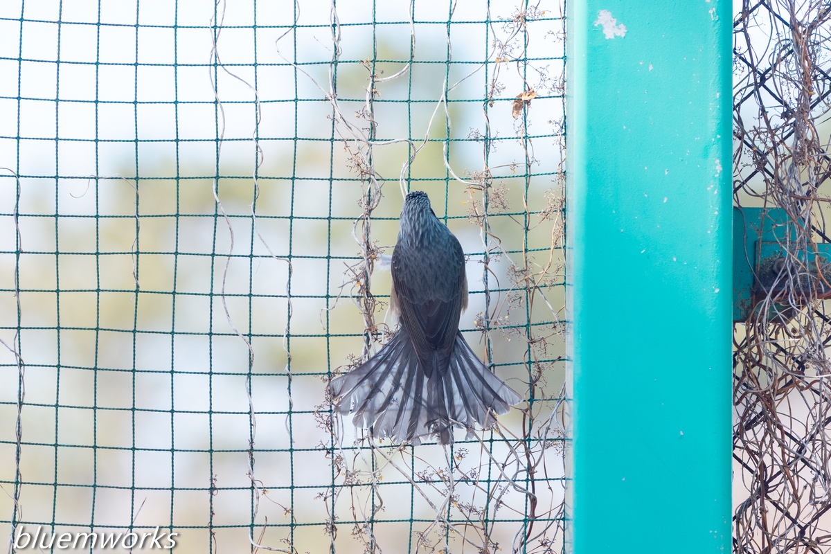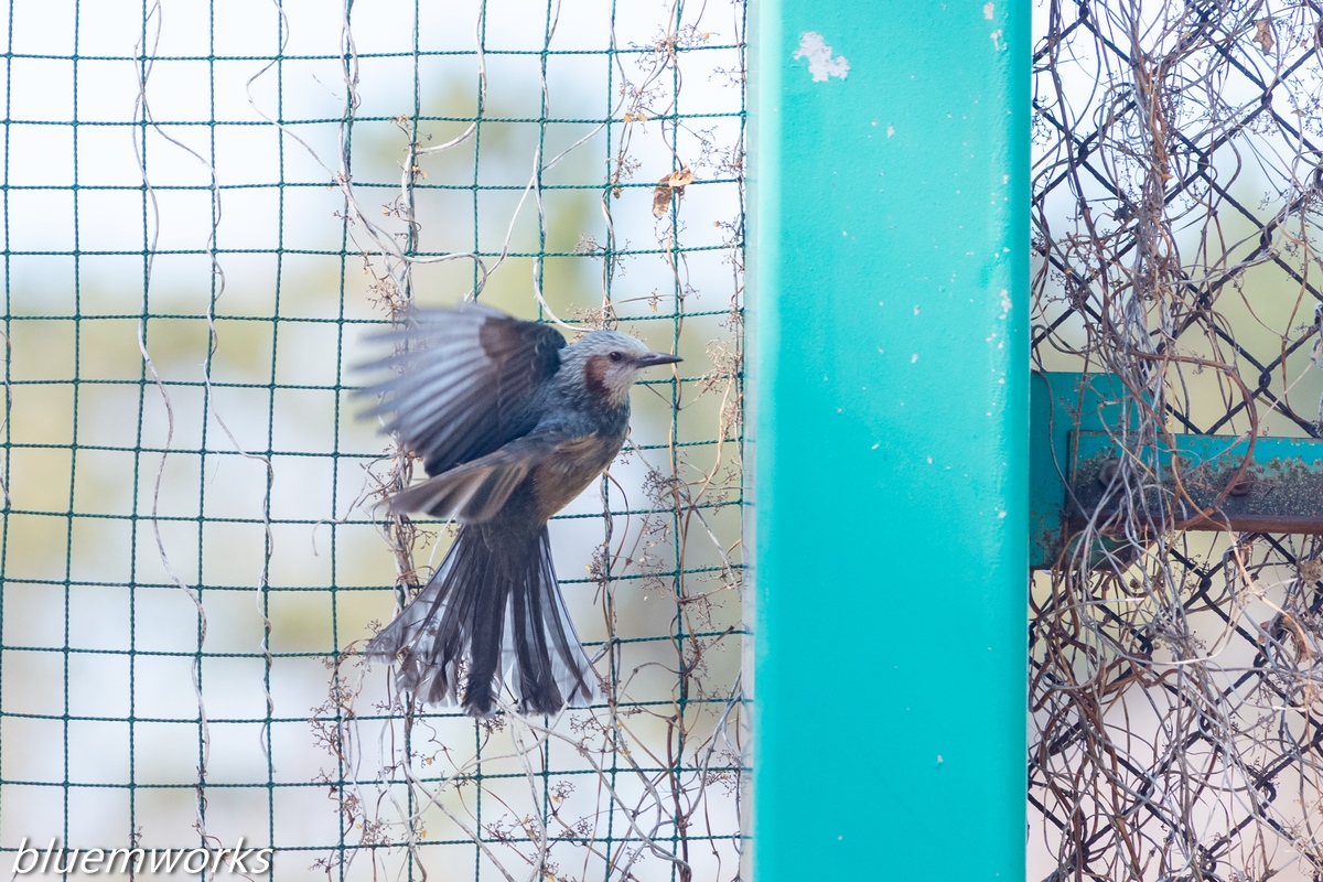 草野球場のネットで、ヒヨドリが野球場観戦をしていました。