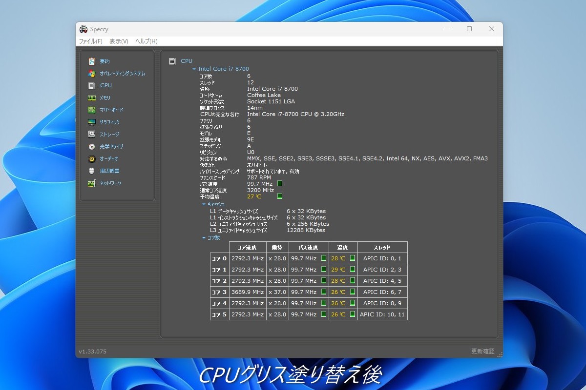 自宅PC:CPUグリス塗り替え後 自宅PCのCPUグリス塗り替え後の報告です。普通に使って10分程放置した状態で27℃です。 CPUグリス塗り替え前 そしてこれが塗り替え前で、同様の時間を置いて測定した温度でしたが32℃を示しています。32℃でも問題ありませんが、塗替え後の27℃と5℃も違うので、グリス劣化とその性能を実感しますね。 自宅PCその後のCPU温度 bluem 2026/04/15 PC関係 No Comments