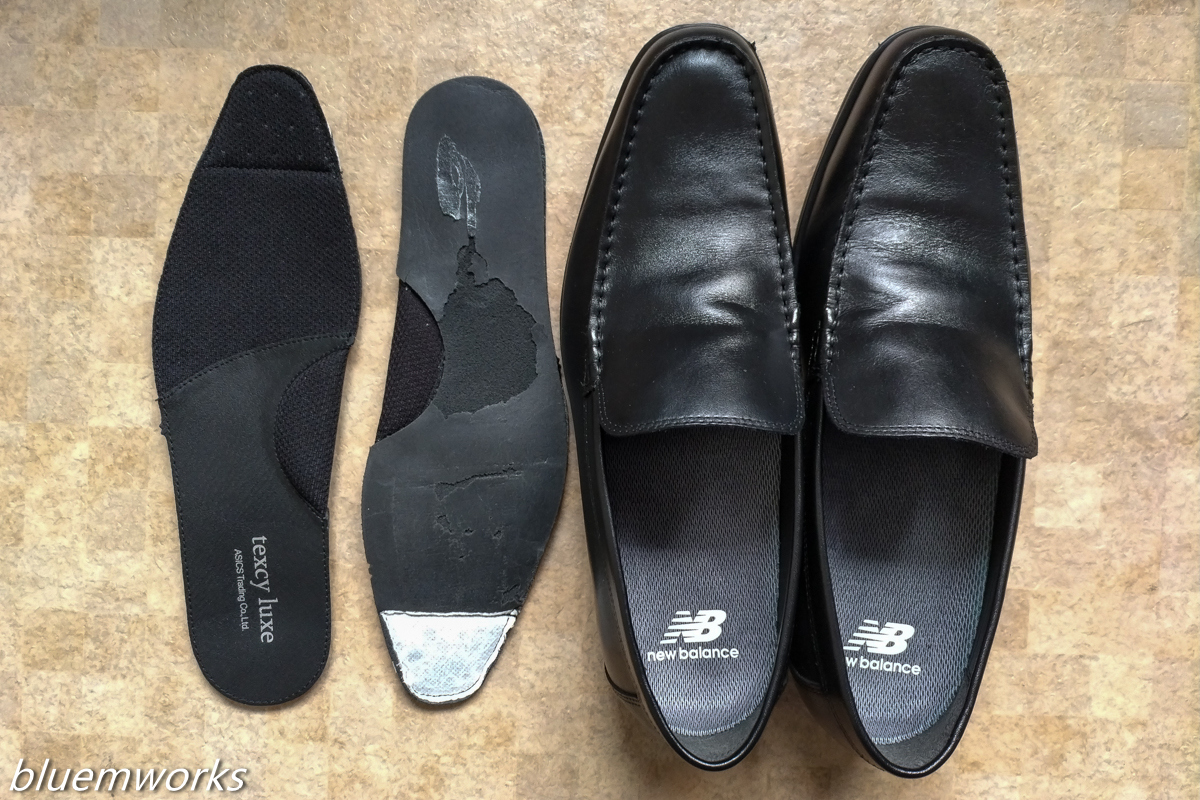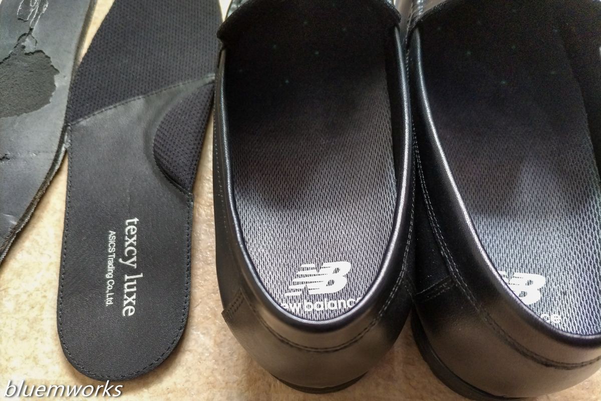 テクシーリュクスのインソールですが、そのままニューバランスのインソールを入れると足がきつくて、結局オリジナルを外してから装着しました。
